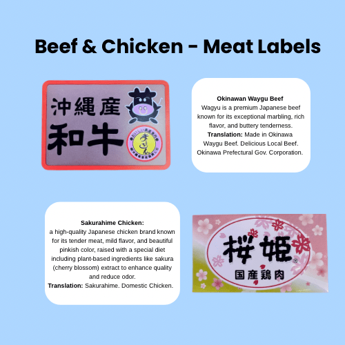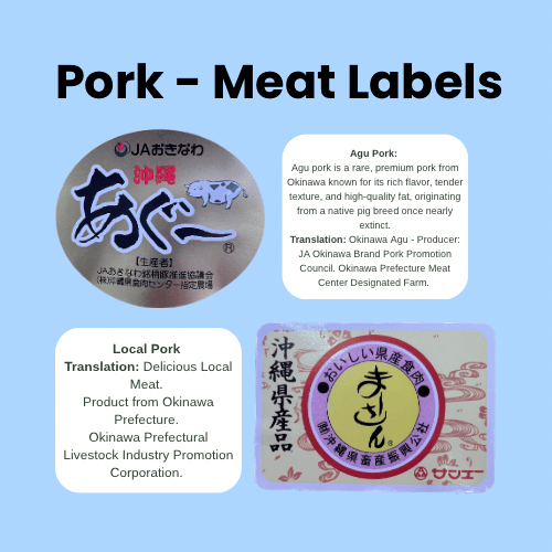 Take a look at these two pork labels—both promote locally sourced pork, but only one specifies that it’s Agu pork, a prized native Okinawan breed known for its rich flavor and higher fat content.
