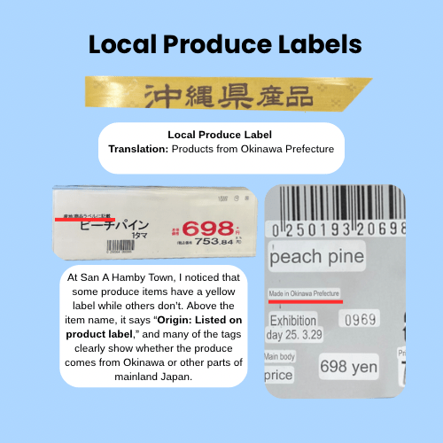 At San A, I learned that while some local produce is clearly highlighted, not everything that’s local gets a flashy label. For example, the spinach I picked up had a large, bright yellow label noting it was grown in Okinawa. But right next to it, another bundle of produce had a much more plain label—the kind you see on most items. At first glance, it didn’t stand out, but a closer look at the item’s tag revealed it also said “Made in Okinawa”. So just because something isn’t highlighted doesn’t mean it’s not local—you just might have to dig a little deeper!