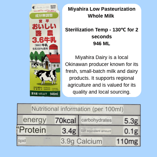 Okinawan grocery stores offer plenty of choices, but I gravitate toward low-pasteurization milk. It’s as close as you can get to raw milk while still being shelf-legal, and it retains more of the natural enzymes, beneficial bacteria, and nutrients that support digestion, calcium absorption, and gut