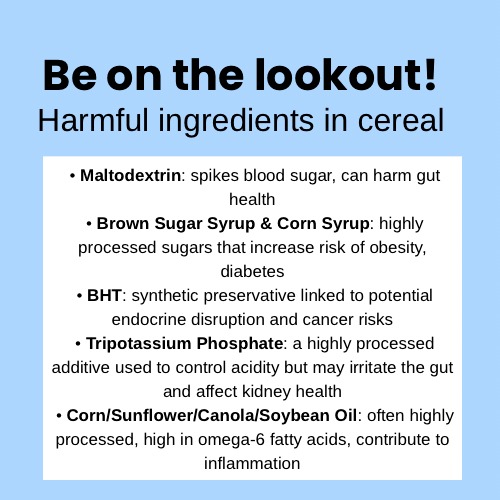 Choosing cereals with clean ingredients matters. Additives like maltodextrin, corn syrup, unhealthy oils, and preservatives like BHT can lead to blood sugar spikes, inflammation, and long-term health risks. Stick to simple, whole foods for a stronger start.