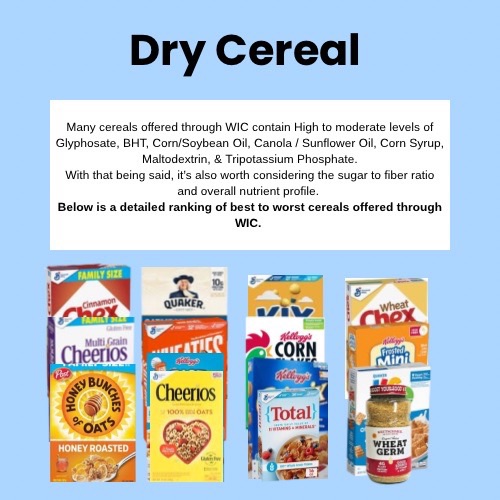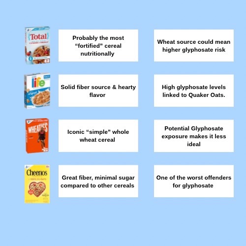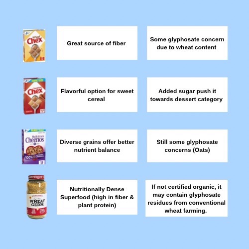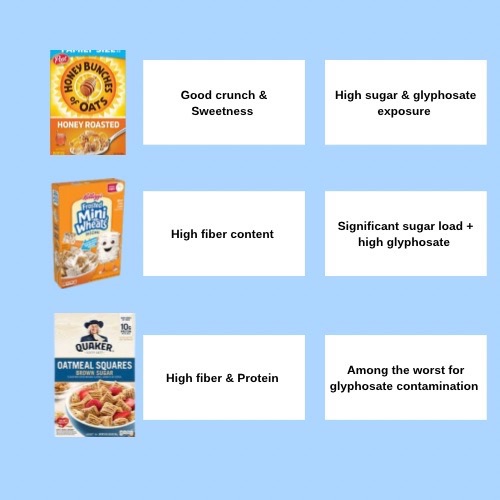 13. Honey Bunches of Oats. •Ingredients: Corn, Whole Grain Wheat, Sugar, Whole Grain Rolled Oats, Almonds, Rice, Canola and/or Soybean Oil, Wheat Flour, Malted Barley Flour, Corn Syrup, Salt, Molasses, Honey, Caramel Color, Barley Malt Extract, Cinnamon, Natural and Artificial Flavor, Annatto Extract (Color), BHT Added to Preserve Freshness. (BUMMER I know). •Nutrition: High sugar, lower fiber than expected. •Glyphosate risk: High (Oats & Wheat). •Pro: Good crunch and sweetness •Con: High sugar & Glyphosate exposure