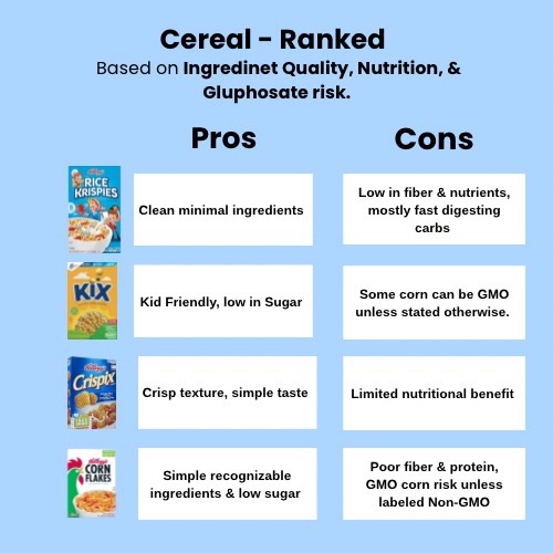 malt extract, sugar, salt. •Nutrition: Very low sugar, low fiber, low fat. •Glyphosate risk: Moderate- Corn is often genetically modified and treated with glyphosate during farming. However Corn Kernels (unlike oats or wheat) typically absorb less glyphosate compared to grains sprayed directly pre-harvest. Source. •Pro: Very simple recognizable ingredients, low sugar. •Con: GMO corn risk unless labeled otherwise, and poor fiber / protein.